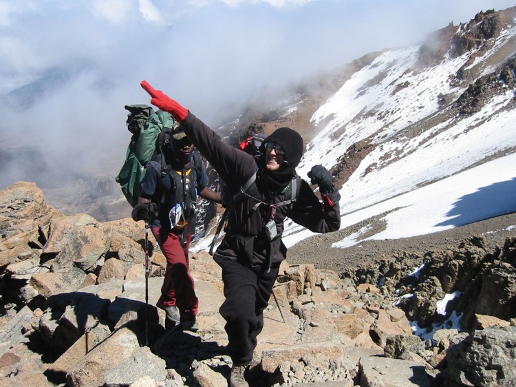 Nate, my #1 son, joined me in Africa. I chose the most difficult route, the Western Breach. This image is Nate reaching the top of the Breach after completing several rock scrambling sections. We knew the summit (19,340 ft.) was only an hour away the next morning after camping at 18,888 ft. Our joy is reflected in the pose he struck for the photograph, the hard part was over. Little did we know that sleep would be impossible for the Cheeseheads at that altitude. We talked all night about the climb and the food we’d eat back in Wisco. Attempts at sleep ended by being startled awake by suffocation.