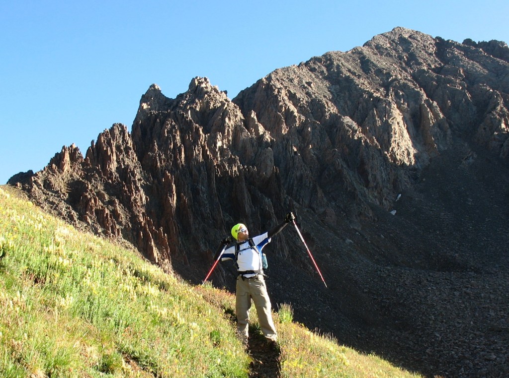Chris, our #2, copped the pose prematurely. This was enthusiasm for our first Colorado 14er, Mt. Sneffels. Colorado has Fifty-eight mountains above 14,000 ft.