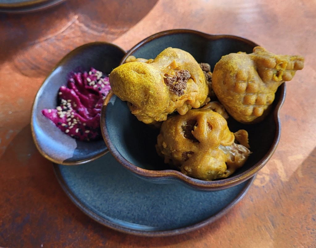 The list of starters included a deep-fried cauliflower beignet with a beet puree. I lived in the French Quarter of New Orleans in the 70’s, that’s a different story for another time, memories of The Cafe Du Monde you see. Anyway, I had to order that. The beignet had a soft crunch with the lightly grilled cauliflower inside. The puree had a hint of spice that lingered after the swallow. Wow, who thought of this?
