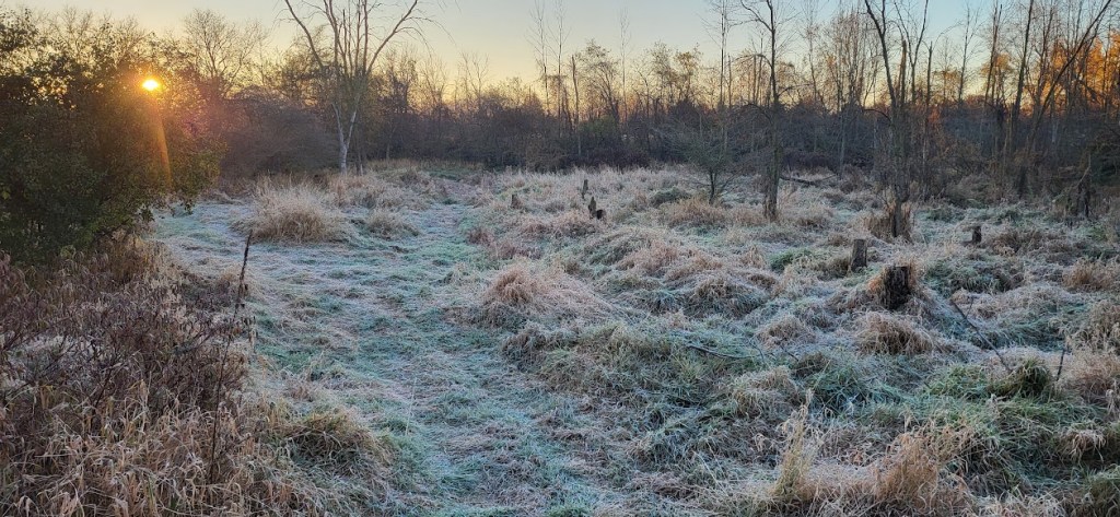 Today the woods, the marsh, and my stand are covered in frost. Lucky me, the deer walking through the waist high foliage will sound like a zipper. As the light comes up, the marsh carries the subtle undulations of a gigantic bowl of oatmeal. The layers of temperature creating what looks like steam. Birds begin to chirp and the early silence become a cornucopia of life.